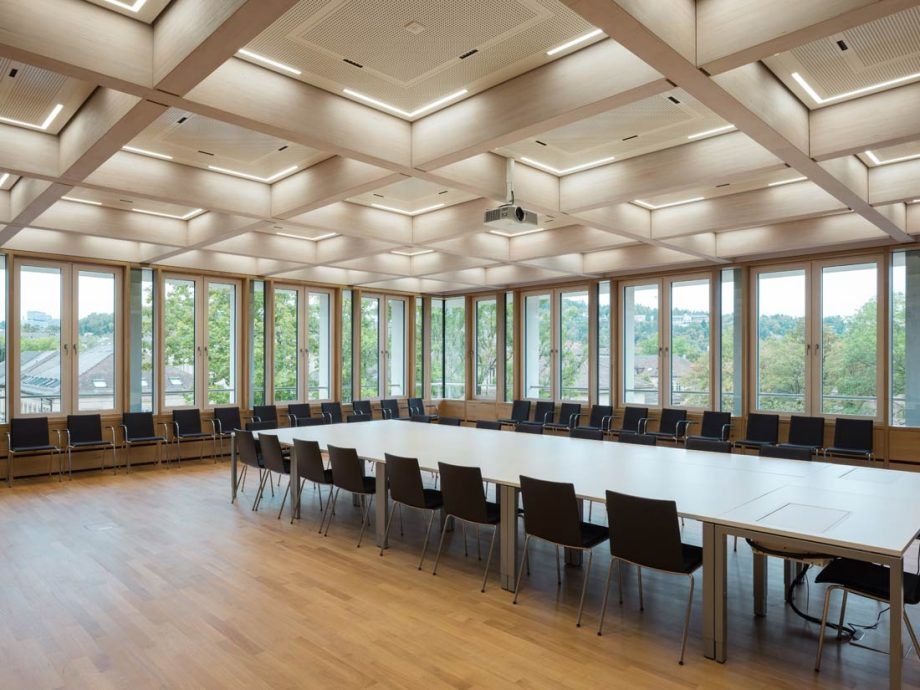 La elección de este material no es casualidad en un proyecto marcado por el respeto a objetivos sostenibles en todos los ámbitos de su desarrollo. Los grandes ventanales que recogen la luz, donde despliega todo su esplendor la viga laminada de roble, colaboran a tal fin con el hormigón reciclado o la energía geotérmica obtenida por los sistemas solares instalados.