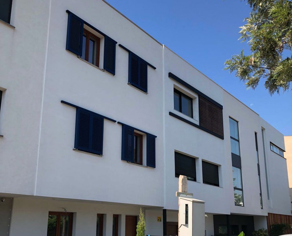 En cuanto a la carpintería exterior, las ventanas son de madera con doble vidrio bajo emisivo y cámara de aire rellena de gas argón. Las fachadas, realizadas con panel CLT, cuentan con aislamiento térmico exterior (SATE) de fibra de madera y mortero de silicato de color blanco.