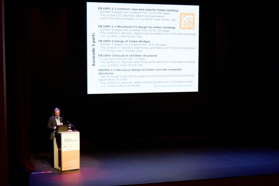 Proyectar y construir con madera”: Ese fue el título del tercero de los bloques del 5º Fórum Internacional de Construcción con Madera, celebrado en el Palacio Baluarte de Pamplona. En él, Tomi Toratti, Senior Advisor de la Federación de Industrias Finlandesas de la Madera, desgranó la nueva versión del Eurocódigo 5, hasta hace pocos días en proceso de votación. Esta actualización incorpora nuevas tecnologías con madera e introduce mejoras significativas a la resistencia al fuego, entre otros cambios.