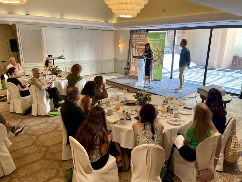Ana Belén Noriega, directora general de PEFC España, presentó la iniciativa internacional Tomorrow’s Timber Talks, sesiones inspiradoras dedicadas a explorar las nuevas tendencias en arquitectura y construcción con madera. Noriega subrayó que “la madera es un material seguro y eficiente, que juega un papel clave en la transición hacia una construcción baja en carbono”.