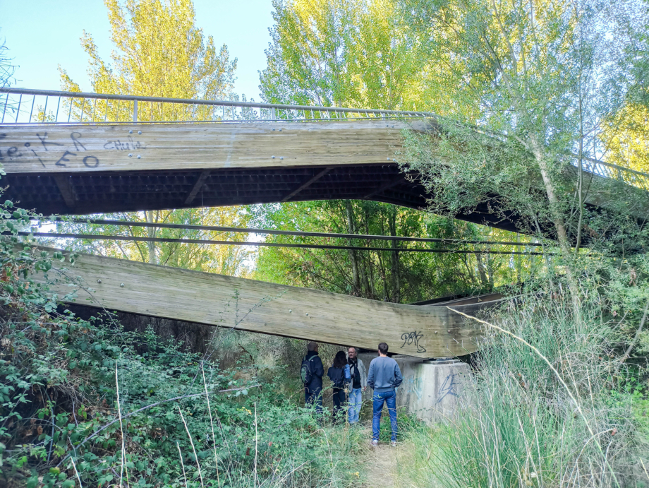 Comienza el cuarto día de viaje visitando la pasarela sobre el río Torío en el parque de la Candamia de León. Esta pasarela peatonal ejecutada en el año 2003 en madera laminada encolada GL28h, cuenta con 3 tramos de 12,75 + 41,00 + 12,75 m de luz, e incorpora como tirantes 2 pletinas metálicas. Agradecemos a Guillermo Capellán la información facilitada sobre la obra.