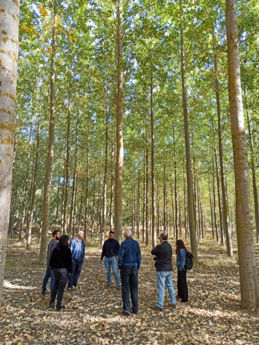 La siguiente visita fue una chopera en la orilla del río Esla en el término municipal de Villamañán. Sergio Fernández de Bosques & Ríos explicó el manejo de las choperas, clones existentes y más utilizados, plantación, poda, valor de los fustes y modelo de explotación. En este caso se visitó una chopera de 15 años, que estaba lista para cortar, compuesta de 2 clones de chopo diferentes. Se planta en marco 6×6 m a profundidad de la capa freática, sin reponer marras y se poda desde los 2 años para favorecer el crecimiento recto. Esta madera se subasta y la adquiere diferentes empresas, entre ellas Garnica que fue la siguiente parada.