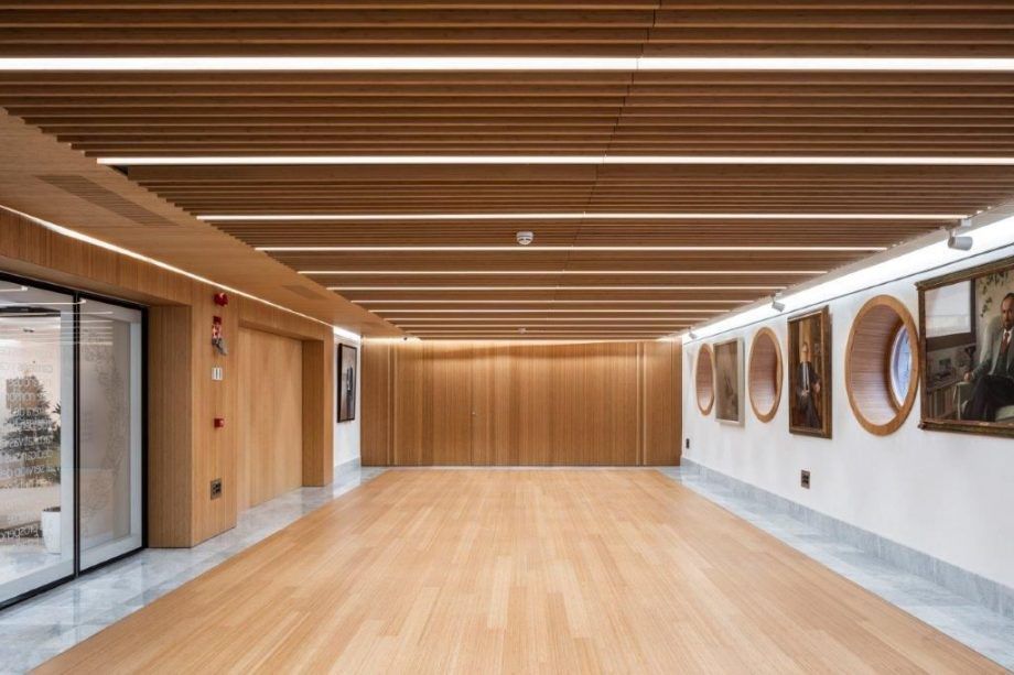 La sala polivalente incluye, además, entre sus soluciones un novedoso sistema de carpinterías mixtas: madera de iroko al exterior, que reproduce el mismo diseño de las ventanas originales del edificio (el cual está protegido) y bambú́ al interior, que se incorpora a la nueva decoración del espacio (con una estética contemporánea para unos ambientes señoriales).