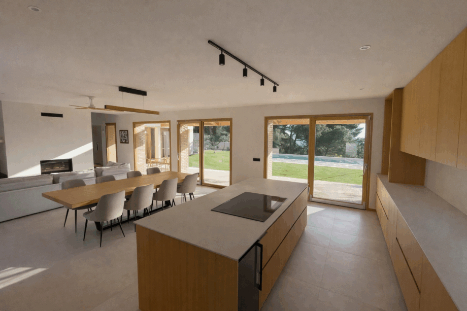 La cocina abierta, realizada con la misma madera que los cerramientos, es una de las piezas clave que elevan la calidad visual a todo el interiorismo.