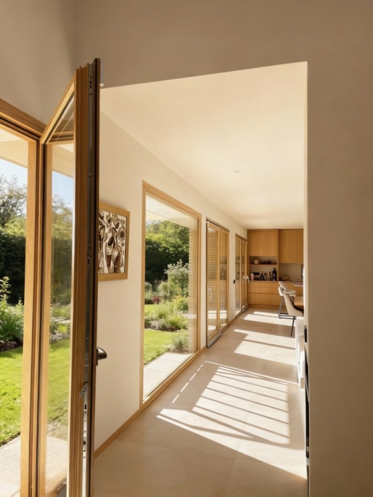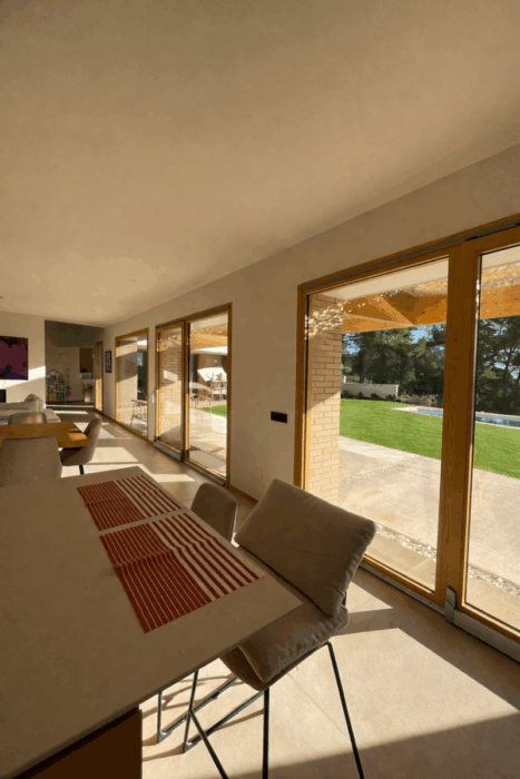 De hecho, el texturado y color natural de la madera de roble para las ventanas, balconeras y correderas se han igualado al mobiliario elegido para la cocina y comedor.