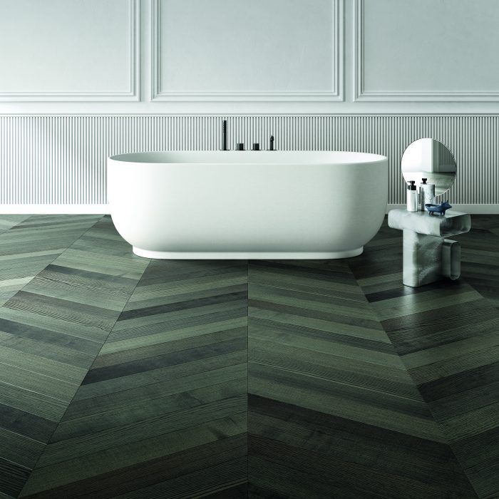 Con motivo del Proyecto Circular, Listone Giordano muestra el pavimento Graphit aplicado a dos colecciones históricas de la marca. Se trata de Slide, la creación geométrica de Daniele Lago, y Atelier Desir, la sofisticada colección cuyo nombre se inspira libremente en la obra maestra de De Chirico La vidente. El primer suelo juega con las formas, con la repetición sin fin y con una refinada elegancia que contrarresta las armoniosas proporciones del segundo, con listones más estrechos y alargados que caracterizaban algunos suelos de madera antiguos, donde las tablas longilíneas se estiraban y fundían en un tejido original.