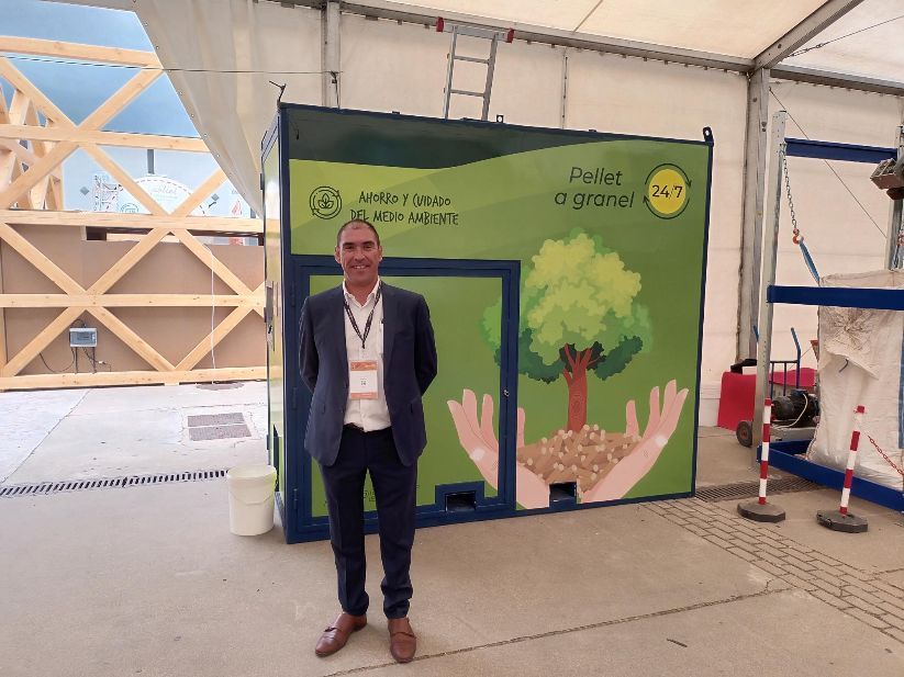 En esta ocasión, además de tener la planta de pellet operativa para hacer demostraciones, llevaron hasta la Feria de Valladolid un dispensador de pellet automático. “Es una máquina de vending de pellet en la que la gente puede comprar 24 horas al día, durante los siete días a la semana en el dispensador. El cliente lleva su propio recipiente, con ello abaratamos el precio del pellet, ya que no gasta plástico y ensacados, y participamos en la economía circular al no utilizar plásticos”, explica Luis Pacheco, gerente de Ecofricalia.