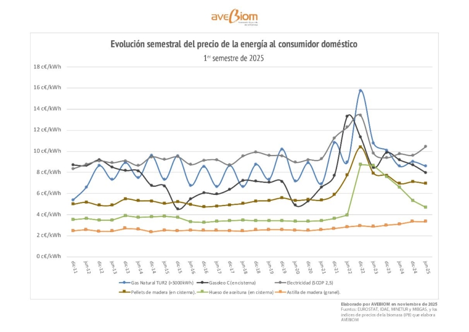 Según los Índices de Precios de la Biomasa (IPB) elaborados por AVEBIOM trimestralmente, el coste medio de la energía para el consumidor final en junio de 2025 se situó en 3,34 c€/kWh para la astilla de madera; 4,68 c€/kWh para el hueso de aceituna y 6,95 c€/kWh para el pellet a granel. En comparación, el gasóleo C alcanzó los 7,98 c€/kWh, el gas natural (tarifa regulada TUR 2) los 8,59 c€/kWh, y la electricidad utilizada en calefacción mediante bomba de calor (SCOP 2,5) rondó los 10,43 c€/kWh útiles.