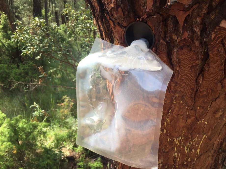 Un método de pica con taladro que se está probando en otras comunidades como Extremadura o Castilla y León. Lo que está claro es que permite mayor pureza de la resina, ya que va directamente a la bolsa sin verse alterada por factores externos, por lo que su precio en el mercado sería mayor, al mantener sus propiedades intactas. “De ser un método rentable, lo que se tendrá que adaptar la industria es a hacer una recogida de la resina en bolsas, ya que solo hay una empresa que lo hace así en la actualidad”, apunta.