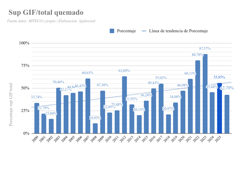 El número de incendios y la cifra de hectáreas quemadas por el fuego en España se ha reducido drásticamente desde las peores cifras de la década de los 90. Sin embargo, los Grandes Incendios Forestales (GIF) -superiores a 500 hectáreas- son ahora el epicentro del desastre: unos pocos son capaces de arrasar con todo, como se está evidenciando estos días. Del 1 de enero al 3 de agosto de este año, los GIF han sido responsables del 67 % de la superficie total afectada.