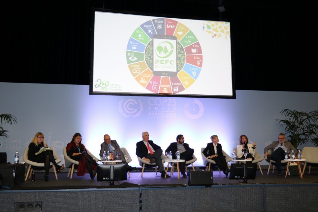 La Cumbre del Clima COP25 dedicó una jornada a los bosques y su papel frente al Cambio Climático. Ana Belén Noriega, secretaria general de PEFC España, participó en el High Level Meeting on Forests, en un panel en el que se buscaban aportaciones para la movilización de recursos para dar soluciones basadas en los bosques. Pamela Castillo Brahona, viceministra de Medioambiente de Costa Rica, Gabriel Quijandría Acosta, viceministro de Desarrollo Estratégico de los Recursos Naturales de Perú, Dirk Forrister, CEO y presidente de International Emissions Trading Association (IETA), Luiz Cornacchioni, presidente de la Associação Brasileira do Agronegócio (ABAG) y Mario Cerutti, director de Relaciones Institucionales y Sostenibilidad de Lavazza expusieron también sus iniciativas.