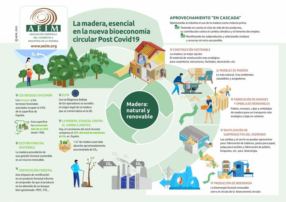 AEIM, Asociación Española del Comercio e Industria de la Madera, presenta una infografía con el título: “La madera, esencial en la nueva bioeconomía circular Post Covid19”. Dicha infografía pretende destacar y difundir estas cinco ideas básicas:
