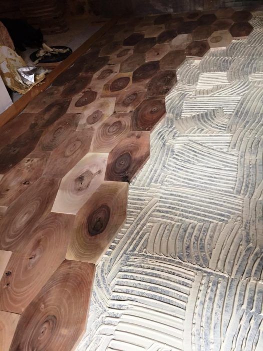 Una baldosa de nogal procedente de plantaciones propias, realizada artesanamente en los talleres de WOODNA y acabado en obra con BONA Traffic Natural.