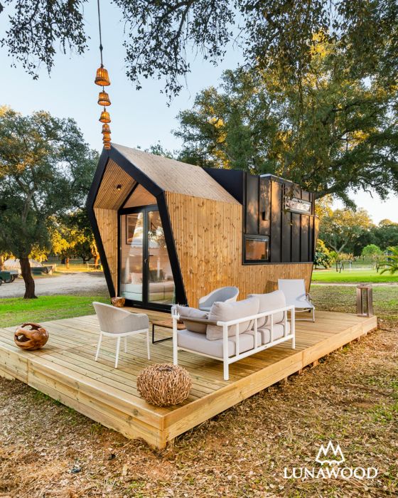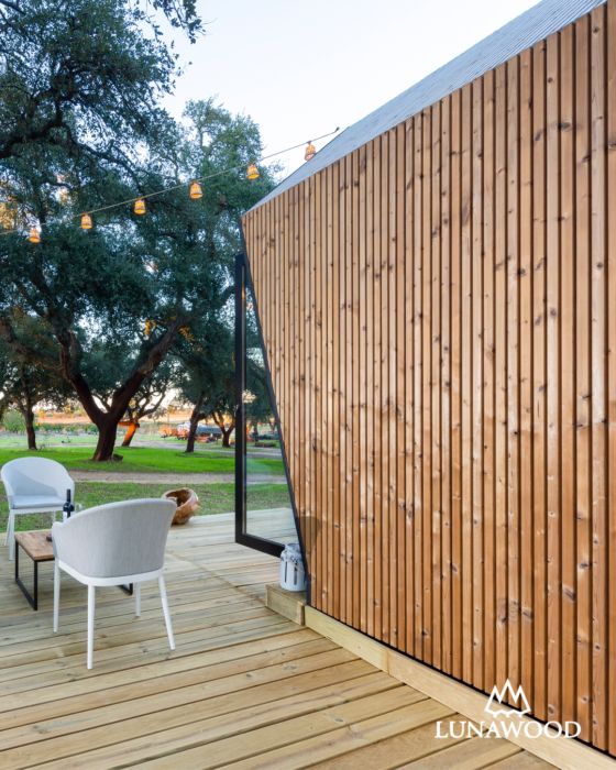Esta original ‘tiny house’, construida con materiales ecológicos y renovables, está revestida con los paneles de la marca de madera finlandesa Lunawood Thermowood, que Gabarró distribuye en exclusiva en España, lo que les otorga un aspecto natural y contemporáneo además de ser totalmente sostenibles.