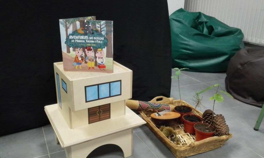 A través de un taller y una lectura dramatizada, realizada por la cuenta cuentos Cris de Caldas y Xabi do Camiño, los tres cerditos viven diversas aventuras con su amigo el jabalí en un bosque lleno de castaños, pinos, eucaliptos, saúcos (sabugueiros) y alcornoques (sobreiras) de los que obtienen alimentos (setas, frutos silvestres), medicinas y otros productos como madera, con la que fabrican su propia casa para protegerse del lobo.