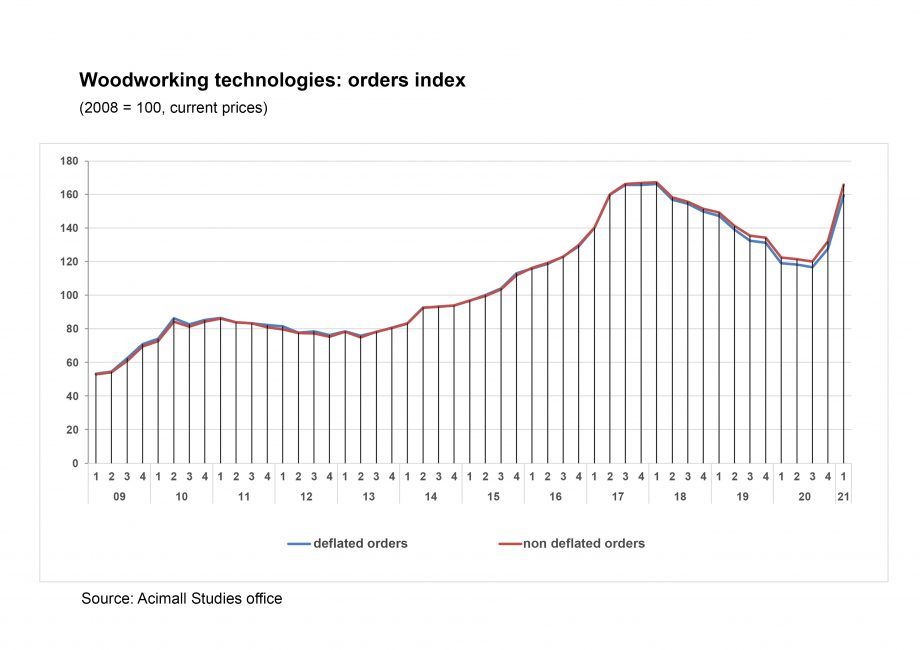 En valor absoluto, la excelente tendencia de los pedidos a principios de 2021 ha hecho que la industria italiana de la tecnología de la madera vuelva a alcanzar sus máximos históricos, logrados en 2018, con un aumento inter trimestral del 17,6%.