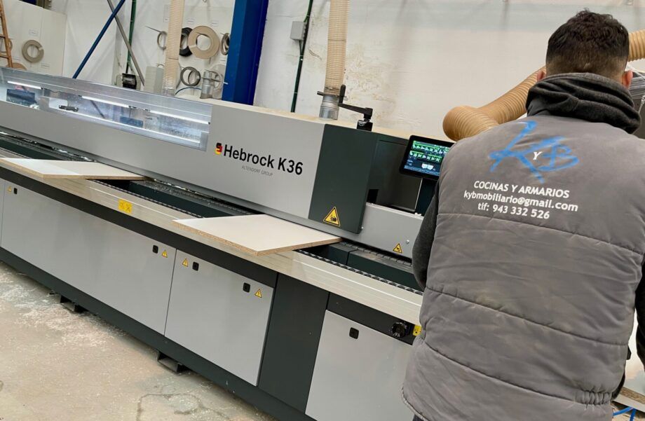KyB 21 apuesta por la calidad y ha comprado a MAESMA una chapeadora HEBROCK K36; uno de los modelos ‘top’ de la marca alemana en su gama de encoladoras de cantos. Con una composición muy completa: Grupo de entrada de retestado del material, que limpia el material para que después actúe la cola. Además, doble rascador de radio, grupo de limpieza y un grupo de achaflanado de los cantos…, además, la K36 incorpora un interesante grupo nesting, para poder cantear piezas ya mecanizadas, y termina con el rascador de superficie, que es precisamente lo que permite que, a su salida, no haya que tocar más las piezas, que están completamente terminadas, listas para montar.