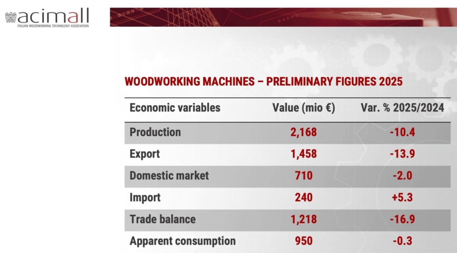 Estas son las cifras procesadas por la Oficina de Estudios de Acimall, la asociación miembro de Confindustria que representa a los fabricantes italianos de maquinaria, equipos y herramientas para la industria de la madera y el mueble.
