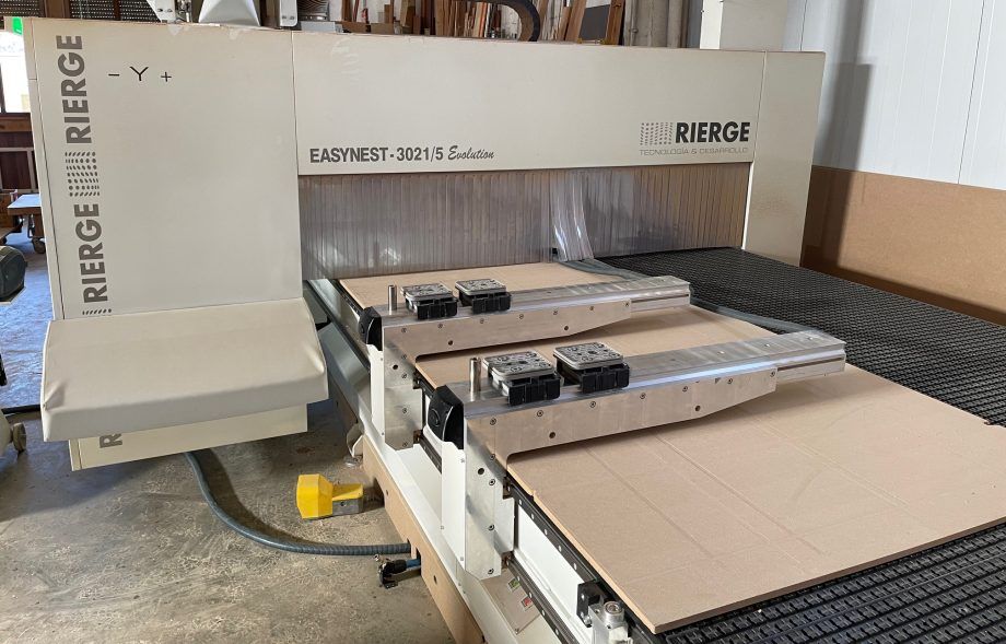 Con la EVOLUTION de RIERGE, en FUSTERIA SARLÉ disfrutan de nesting de cinco ejes, con una mesa de 3 x 2,1 metros, más el sistema “Evolution” de 4 barras de 1.300 mm que se deslizan por la superficie, sin necesidad de poner ventosas encima de la mesa de nesting o del tablero mártir. Una máquina idónea para su labor día a día, debido a la diversa variedad de encargos de los clientes, tanto particulares como profesionales …