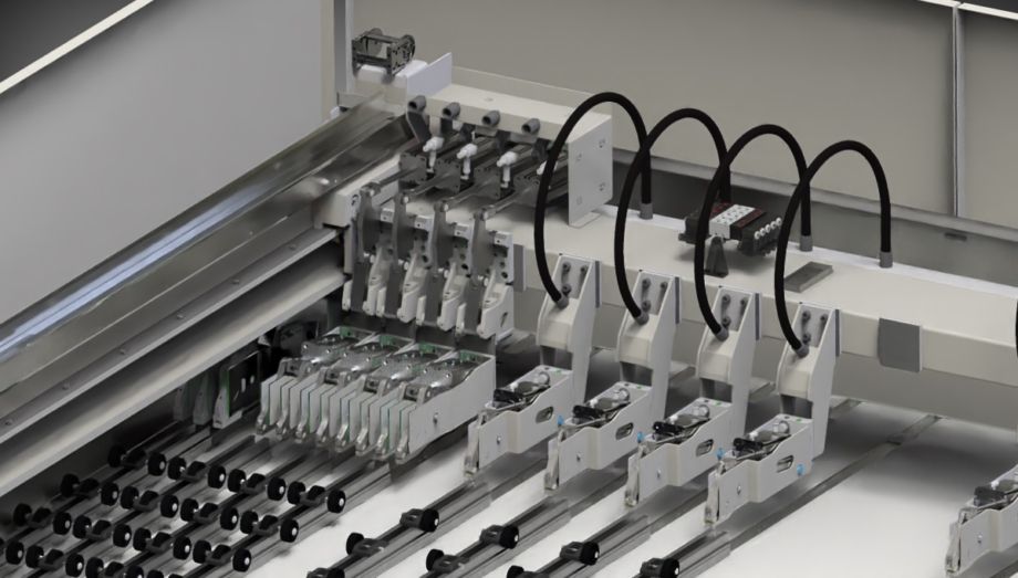 - Dispositivo LED para el posicionamiento guiado de las mesas móviles con colchón de aire: sistema LED inteligente que indica al usuario el posicionamiento correcto de las mesas con respecto al formato de los paneles que se están procesando.