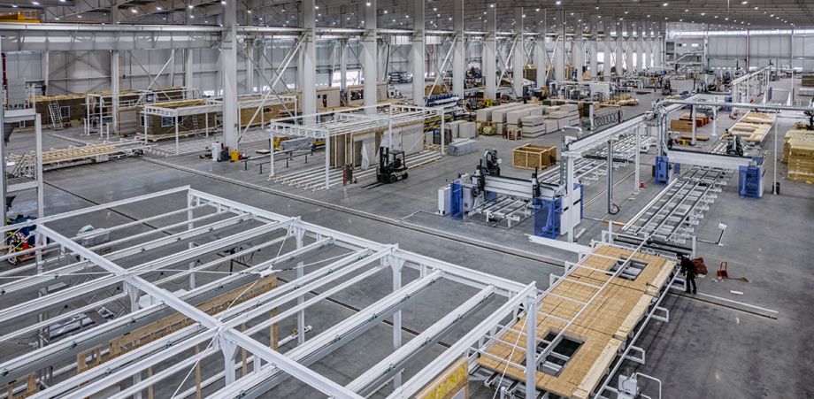 En la nueva planta de producción, la estación de enmarcado automatizada, 16 mesas de procesamiento, cinco puentes multifuncionales, varios centros de corte y dos líneas de montaje de módulos producirán 1000 casas al año.