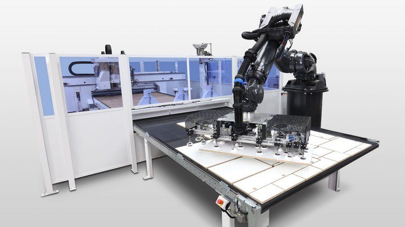 La máquina de nesting CENTATEQ N-600 fresa y taladra piezas. También ofrece la posibilidad de utilizar la tecnología de 5 ejes e incluso de insertar directamente los herrajes de los elementos de unión. Esta máquina de HOMAG puede trabajar con el grupo de fresado Cabineo.