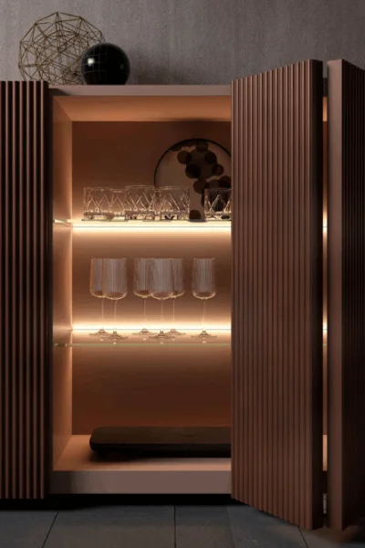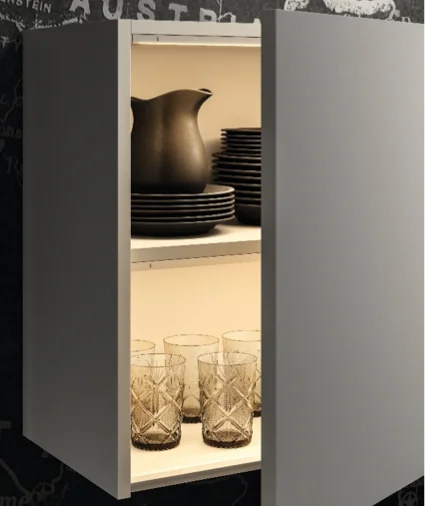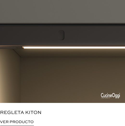 Un ejemplo bien integrado es la Regleta Kiton diseñada para encenderse automáticamente al abrir el mueble. Su instalación es rápida y ofrece una luz regulable que se adapta a las necesidades del momento.