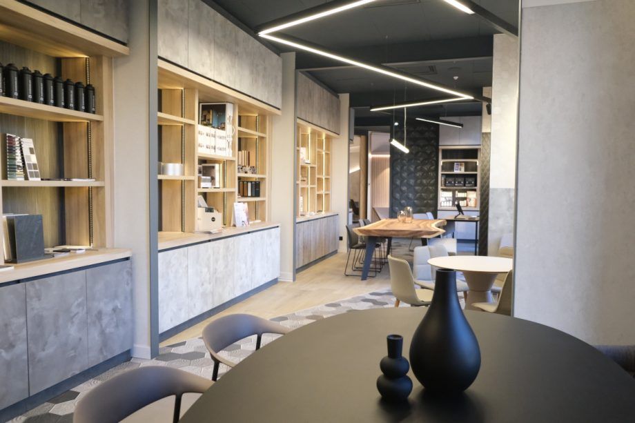 Siguiendo el camino marcado en el suelo encontramos la biblioteca de materiales, un espacio de trabajo para ver, tocar y combinar todo tipo de materiales, texturas y muestras. Para almacenar todo el material técnico del showroom, la sala dispone de un gran mueble expositor de madera iluminado.