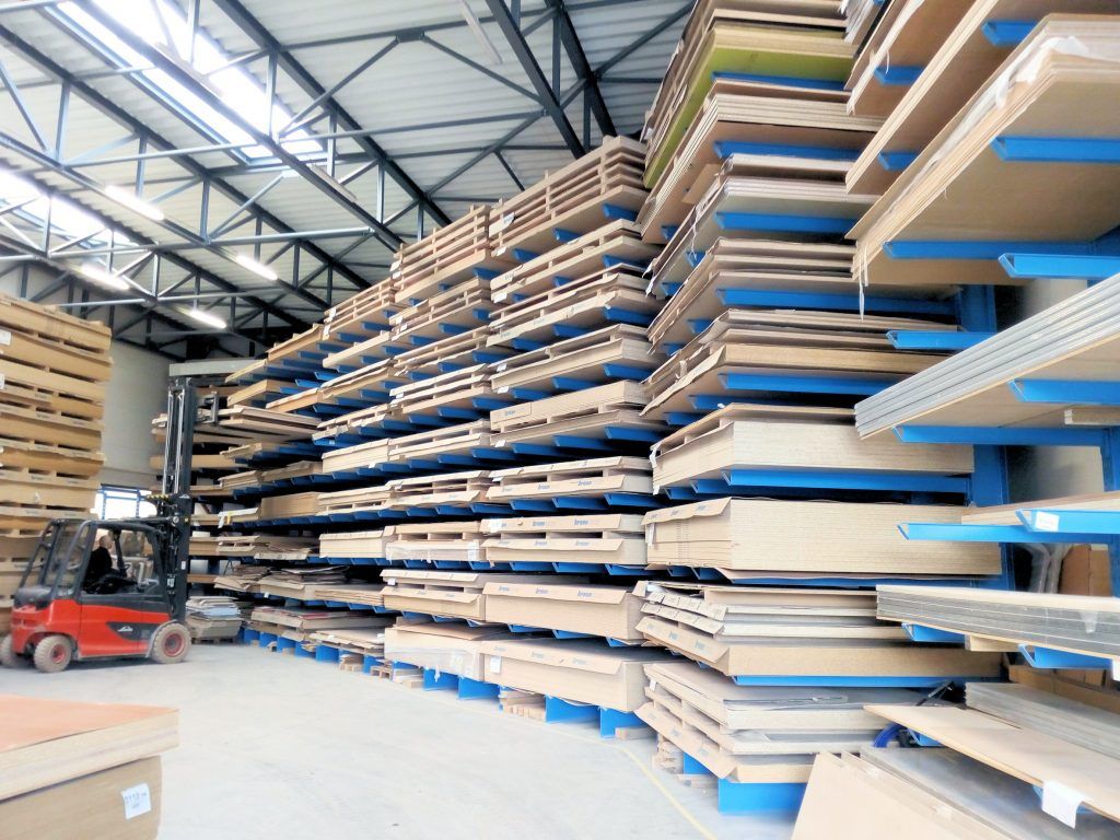 En Lunit las estanterías cantiléver permiten el almacenamiento de paneles de madera pesados sobre nueve niveles hasta una altura de 6.500 mm. Para ello los brazos cantiléver se pueden adaptar rápidamente y sin herramientas a las diferentes dimensiones de las mercancías almacenadas, una vez que se enganchan en una trama cada 100 milímetros en las columnas y no estando atornillados.