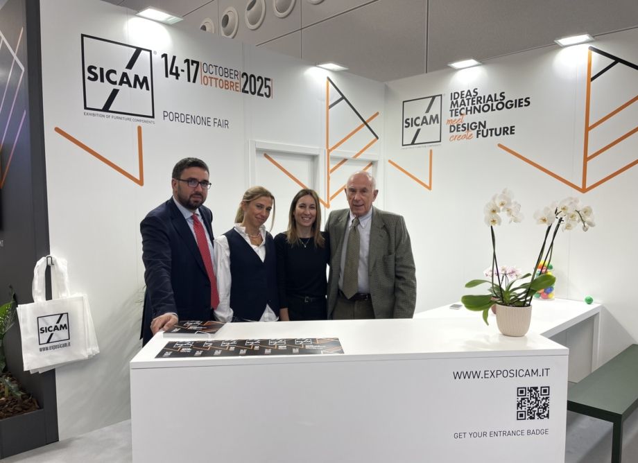 SICAM, Salón Internacional de Componentes y Accesorios para el Mueble, celebrará su 16ª edición de 14 a 17 de octubre en la Feria de Pordenone (Italia). Ideas, Materiales y Tecnologías se encontrarán con el Diseño para crear Futuro. Foto principal: El equipo organizador de SICAM en su stand en interzum 2025, ©Madera Sostenible