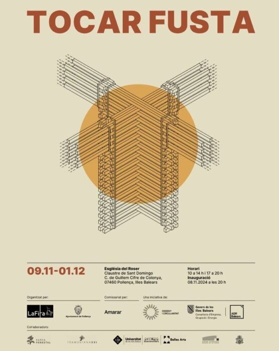 “Tocar Fusta” es una exposición de mobiliario sostenible y de producción local, con piezas realizadas con madera de pinos caídos durante el tifón Juliette en 2023, destacando la importancia de la sostenibilidad en el diseño.