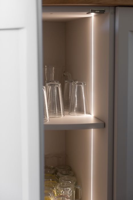 La incorporación de tiras LED Dual Color permite seleccionar, mediante sistemas externos como dimmers o control domótico, el uso de luz cálida (3000K) o natural (4000K) para personalizar al máximo el ambiente de cocina. Mientras la luz cálida aporta intimidad y calidez, la luz neutra/natural mejora la visibilidad para tareas de precisión. La transición fluida entre una y otra hace posible poner a punto el espacio, según el estado de ánimo del usuario o el uso del momento. Con versión sin interruptor, esta opción garantiza entornos despejados y una emisión de luz uniforme.