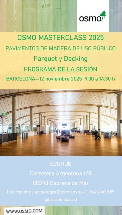El objetivo, además de ilustrar sobre la Oferta Integral de Osmo para suelos de madera en áreas públicas de tráfico intenso, pretende dotar de conocimientos teóricos para trasladar a los arquitectos y proyectistas las soluciones prácticas para este tipo de pavimentos.