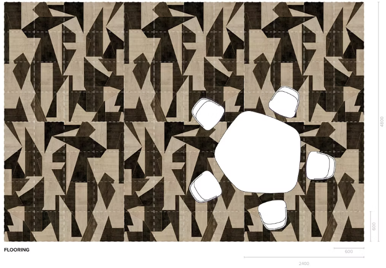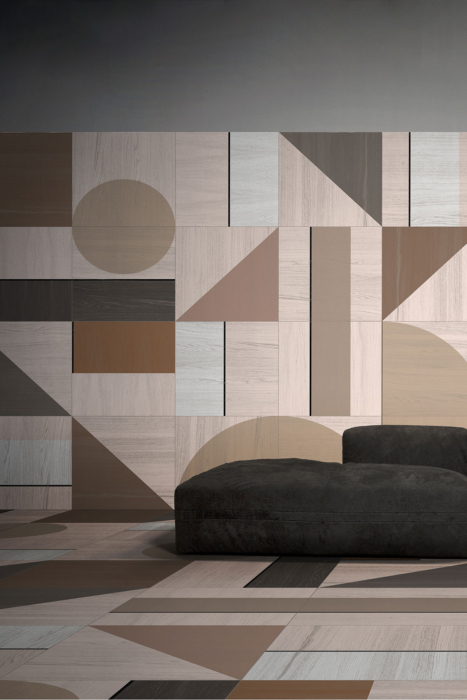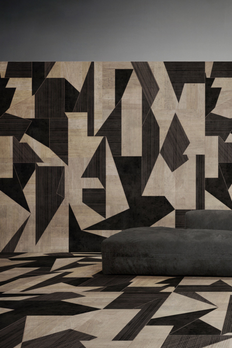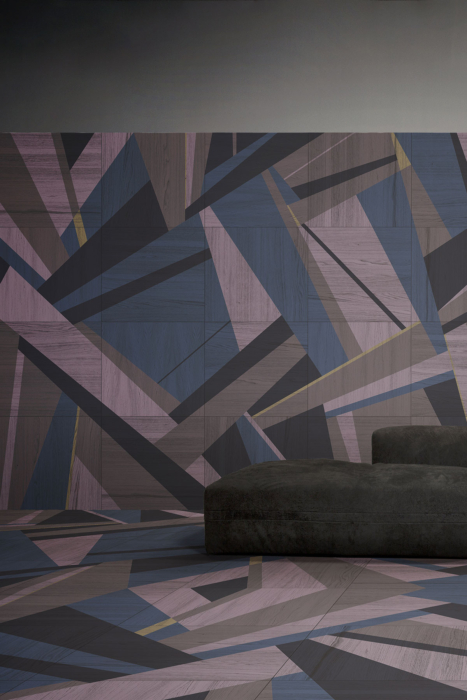 Impresiones sinuosas de geometría, color y patrones evocadores. Al igual que el papel pintado, la madera se transforma en un elemento puramente decorativo en las paredes, mientras que en el suelo se presta a la impresión de texturas rítmicas que evocan las exposiciones de los años 60.