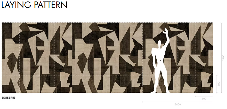 Baldosa de madera preacabada para suelos y paredes con gráfico impreso. Tamaño del módulo: 60 x 60 cm. Apta tanto para suelos como para revestimientos.