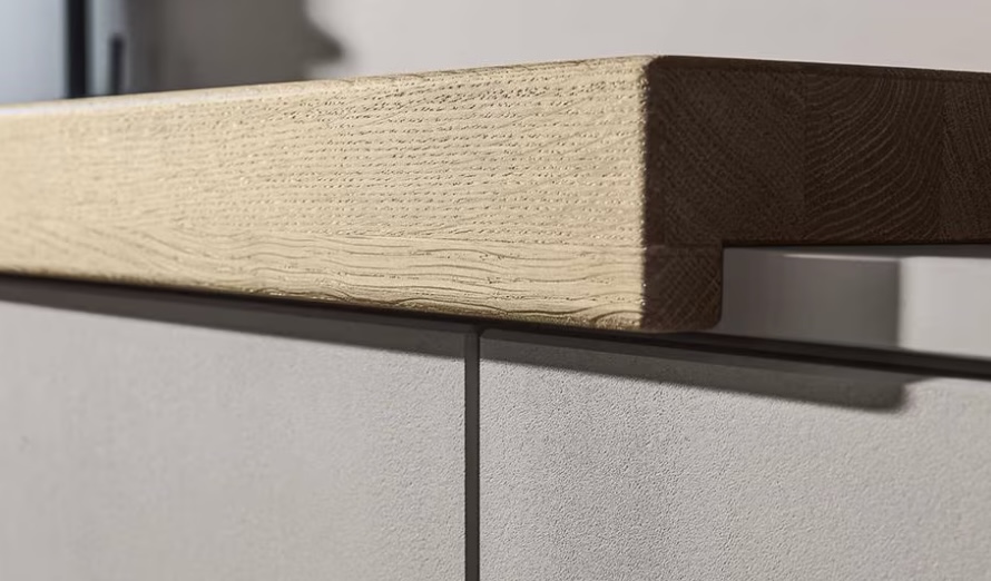 El material muestra una superficie aleatoria con hendiduras que emula fielmente la estética del hormigón y posee un recubrimiento de 2 mm que puede trabajarse fácilmente con herramientas de carpintería convencionales. Un aspecto técnico clave su canto de polímero ABS, que contiene pigmentos internos diseñados para eliminar la apariencia plástica en los radios y garantizar una continuidad visual perfecta con la superficie.