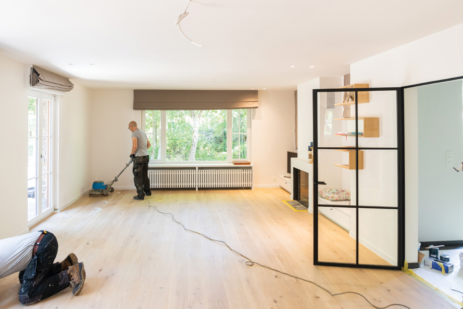 Suelos: Utiliza una lijadora con un pad Rubio Monocoat blanco de 16 pulgadas (40 cm). Cuando hayas terminado todas las zonas, repásalas otra vez con un pad Rubio Monocoat blanco nuevo.
