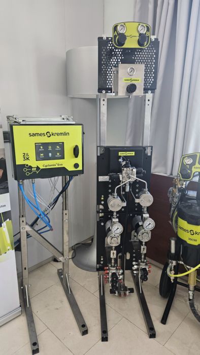 Pero la gran novedad en el evento fue el sistema Ciclomix R Evo. Su particularidad radica en que está diseñado para la aplicación de productos de dos o tres componentes, y es ideal para la madera y materiales derivados. Permite seleccionar diferentes tipos de bases y catalizadores, según explicó en declaraciones a MADERA SOSTENIBLE el técnico comercial en la zona centro en España de SAMES Ibérica, Ricardo Osuna.