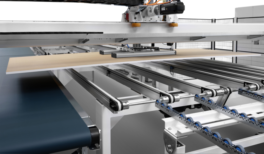 La máquina cuenta con un sistema de circulación de cantos con dos pórticos basados en el pórtico LOOPTEQ O-400, así como con un sistema modular ampliable que permite la integración de un almacén intermedio y ofrece una posición de apilado en el lado de la unidad. La retirada manual flexible de las piezas en la dirección de rendimiento o en la posición real del operador de la máquina aumenta significativamente la eficiencia de la máquina.